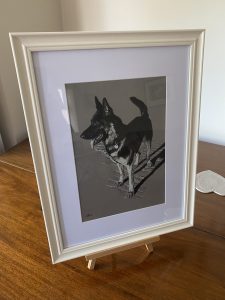 This is an example image (left), that a client sent to me to work from to be able to create the Pastel/Charcoal drawing shown in the photo frame in the image on the right.