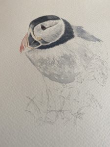 The image on the left shows the progress of a Puffin using watercolours after drawing the initial sketch in graphite pencil. The image on the right is the completed artwork framed in a solid wood real oak frame.