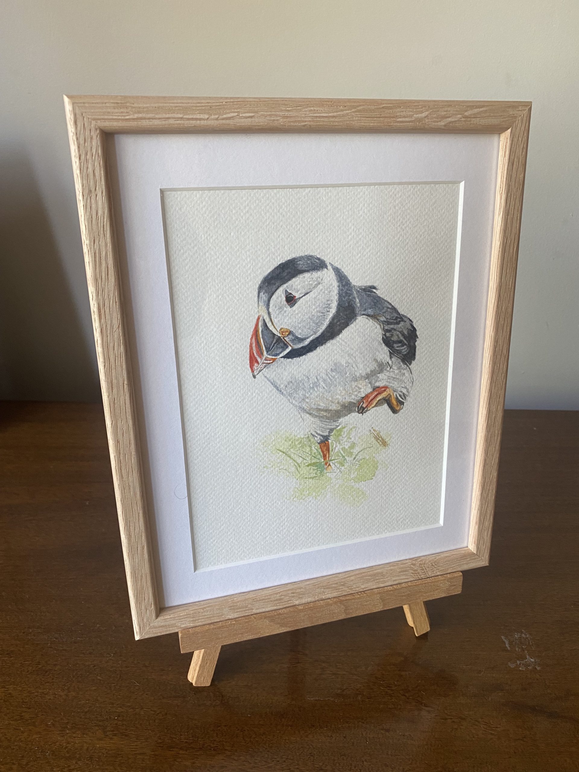 The image on the left shows the progress of a Puffin using watercolours after drawing the initial sketch in graphite pencil. The image on the right is the completed artwork framed in a solid wood real oak frame.