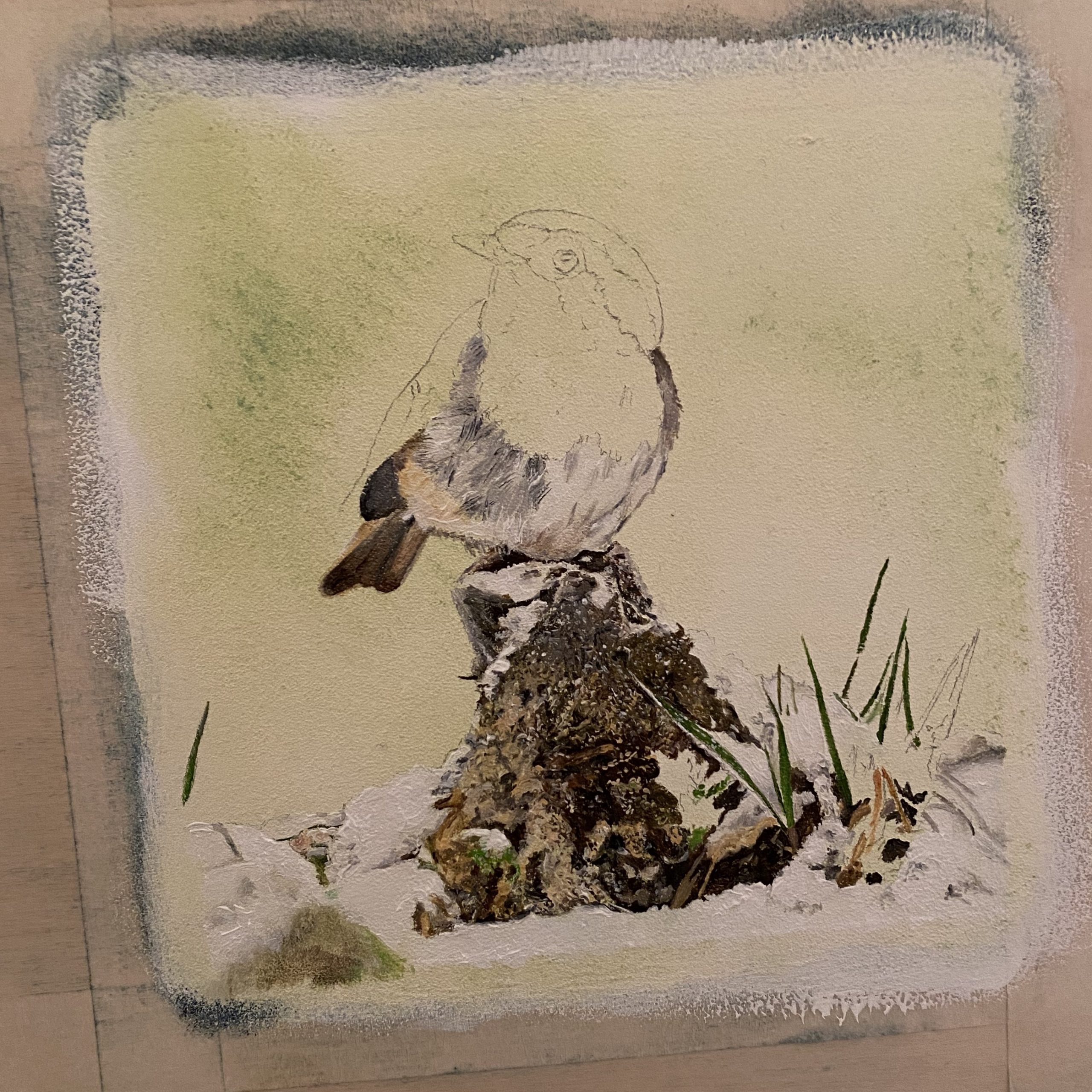 The images above are two examples of my Wildlife Oil paintings. The Robin in progress is painted on wooden panel. The Stag is also painted on a wooden panel set in black frame complete with a card mount.