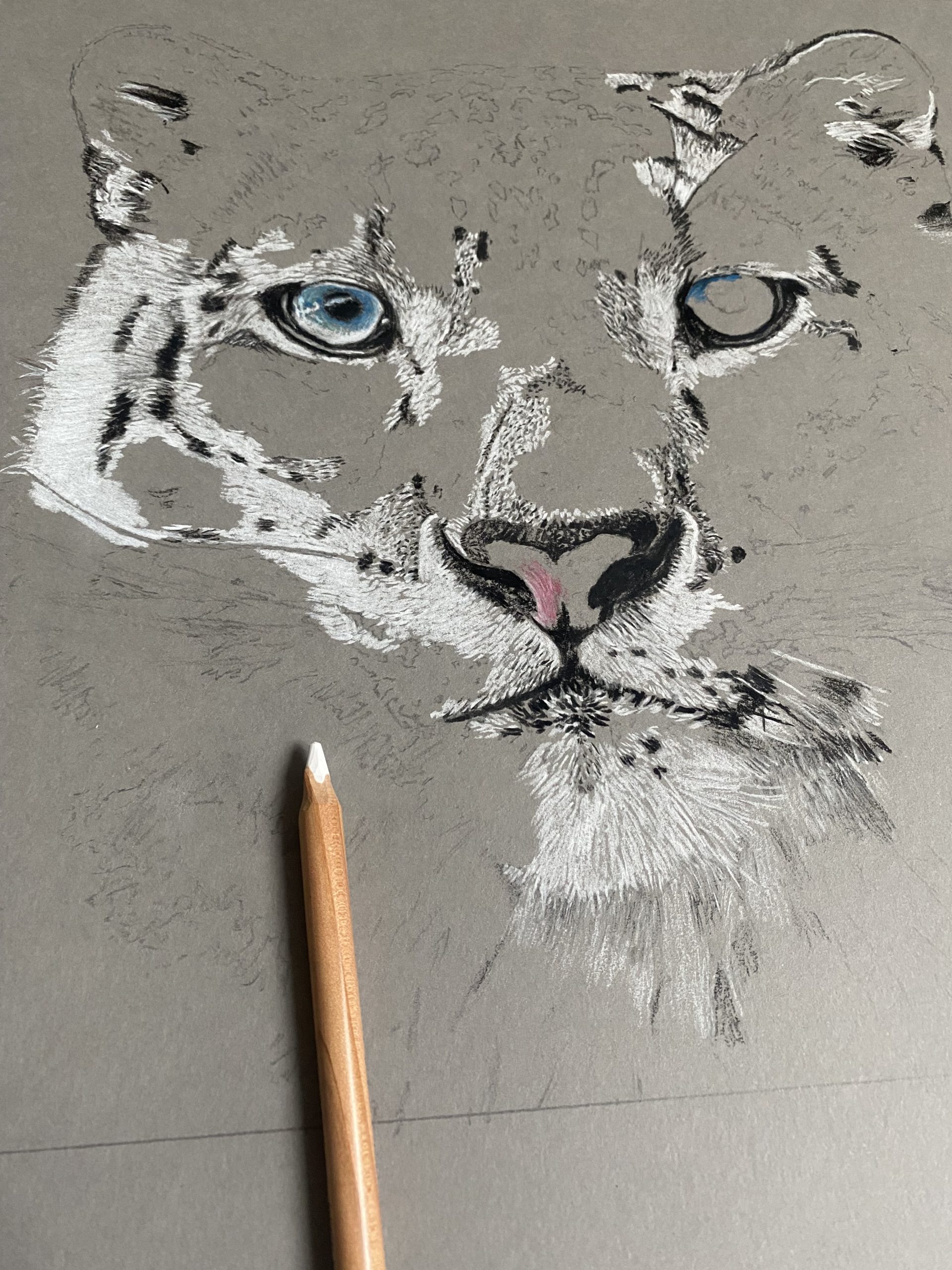 The images above show the progress of a Snow Leopard and Barn Owl* using coloured pastels (black and white in this instance).